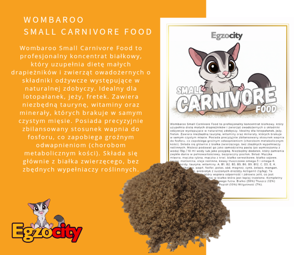 Wombaroo Small Carnivore Food to profesjonalny koncentrat białkowy, który uzupełnia dietę małych drapieżników i zwierząt owadożernych o składniki odżywcze występujące w naturalnej zdobyczy. Idealny dla lotopałanek, jeży, fretek. Zawiera niezbędną taurynę, witaminy oraz minerały, których brakuje w samym czystym mięsie. Posiada precyzyjnie zbilansowany stosunek wapnia do fosforu, co zapobiega groźnym odwapnieniom (chorobom metabolicznym kości). Składa się głównie z białka zwierzęcego, bez zbędnych wypełniaczy roślinnych. Możesz podawać go jako samodzielną pastę (po wymieszaniu z wodą) 15g / 10 ml wody lub jako posypkę. Niezbędny dodatek, który zamienia zwykłe danie w pełnowartościowy, bezpieczny posiłek. Skład: Mączka mięsna, mączka rybna, mączka z krwi, białko serwatkowe, białko sojowe, lizyna, metionina, oleje roślinne, kwasy tłuszczowe omega-3 i omega-6. karotenoidy, tauryna, witaminy: A, B1, B2, B3, B5, B6, B9, B12, C, D3, E, K, biotyna, cholina, wapń, fosfor, potas, sód, magnez, cynk, żelazo, mangan, miedź, jod, selen, prebiotyk z suszonych drożdży Actigen® (1g/kg). To nowoczesny prebiotyk, który wspiera odporność i zdrowie jelit, co jest kluczowe przy diecie bogatej w białko które jest lepiej trawione. Kompletny profil niezbędny do budowy zdrowego futra. Białko (38%) Tłuszcz (12%) Energia metaboliczna (16 MJ/kg) Popiół (10%) Wilgotność (7%).